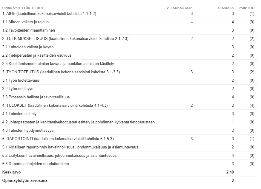 - opinnäytetyön kokonaisarvosana ja arvosanat opinnäytetyön muille opintojaksoille (suunittelu, toteutus, raportointi)