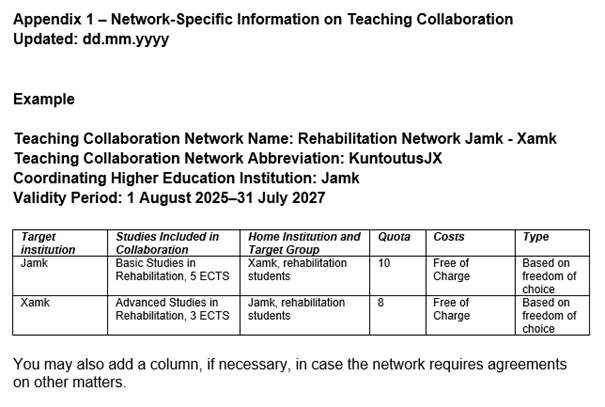 - Contract Appendices: Network Offerings and Contact Persons. If the network has agreed on specific studies/quotas, these will be stated in the appendix. The contracting parties shall negotiate and confirm the courses for teaching collaboration for the upcoming academic year no later than the end of May of the previous academic year. The appendix can be updated without re-signing the Contract. Names and contact details of the contact persons. Below is an example of an appendix.