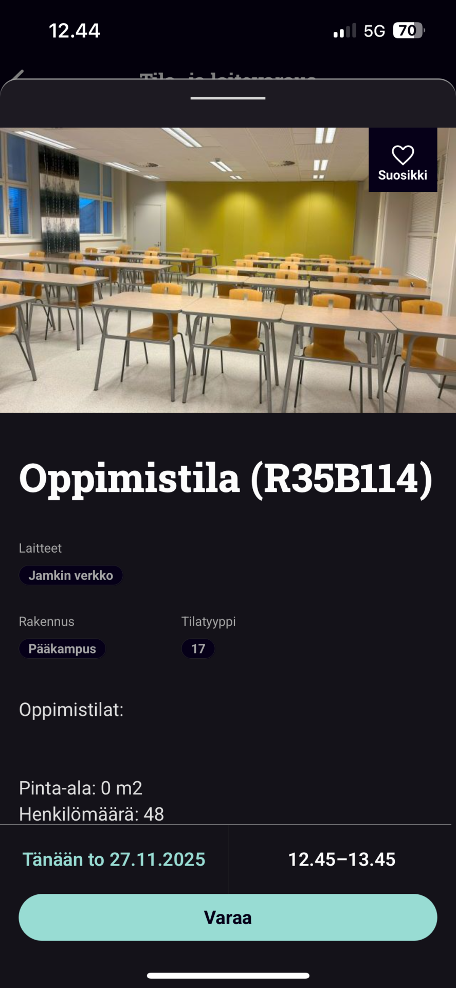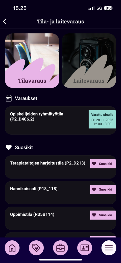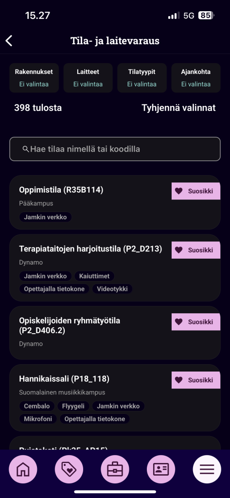 - Voit merkitä tiloja suosikeiksi klikkaamalla sydämen kuvaketta tilan kohdalla. Suosikkitilat näkyvät Tilavaraus-näkymän etusivulla.
